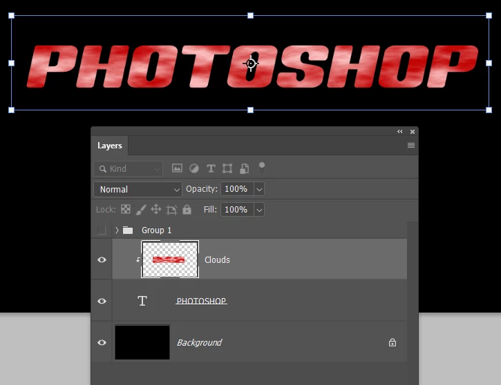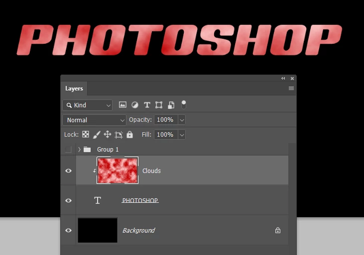 Right click the clouds layer and chose Create Clipping Mask this will cause it to only show against the underlying type layer.