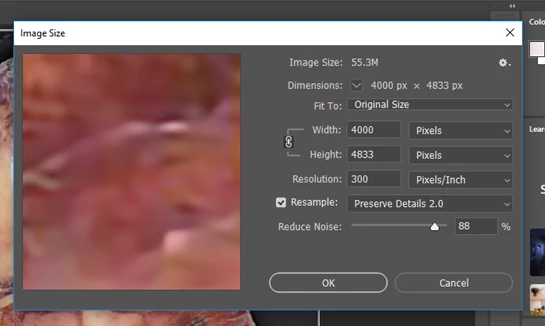 4000 PIXELS WIDTH>RESAMPLE: PRESERVE DETAILS 2.0>MAGNIFY IMAGE TO 100% >>REDUCE NOISE TO 88%>OK