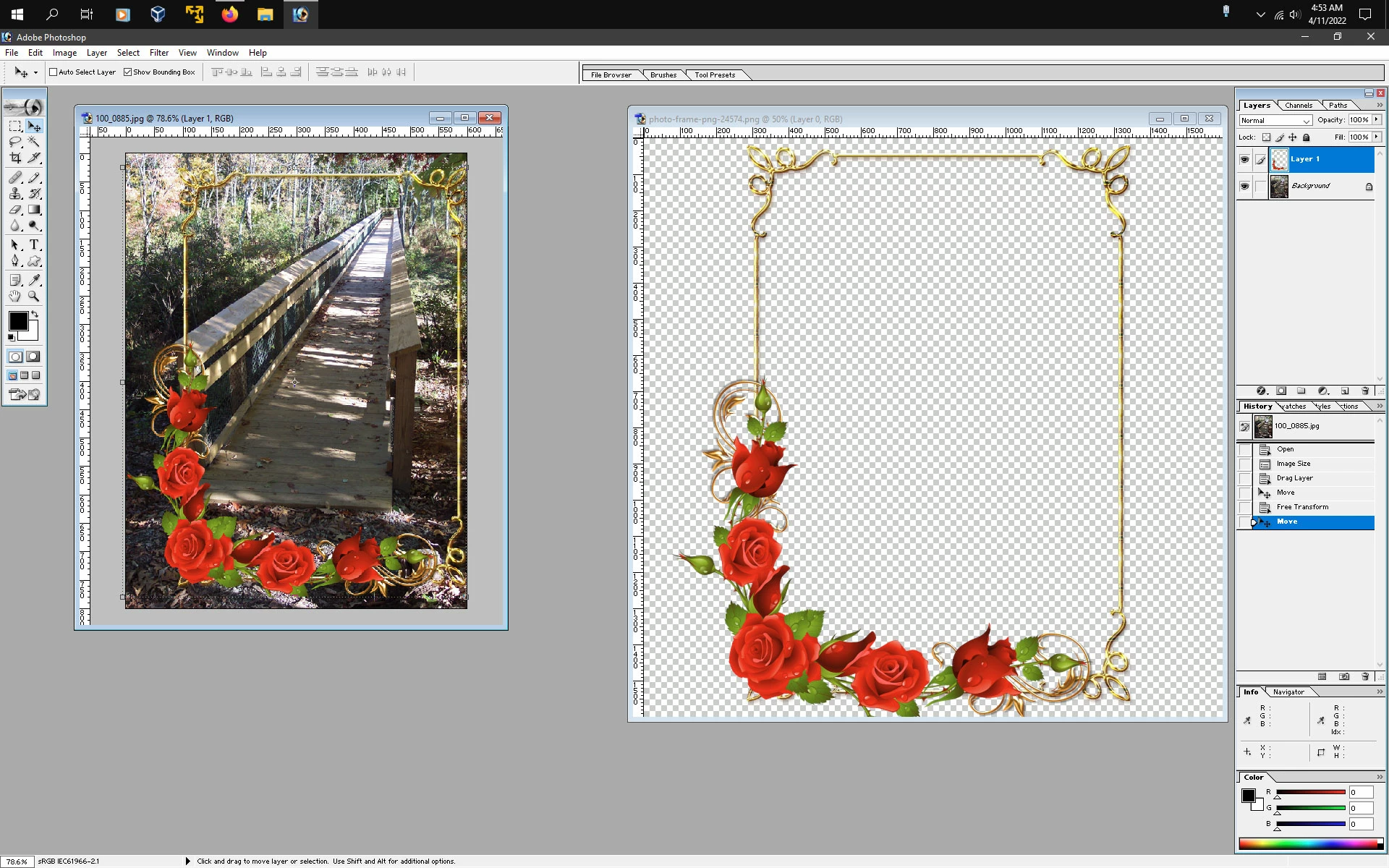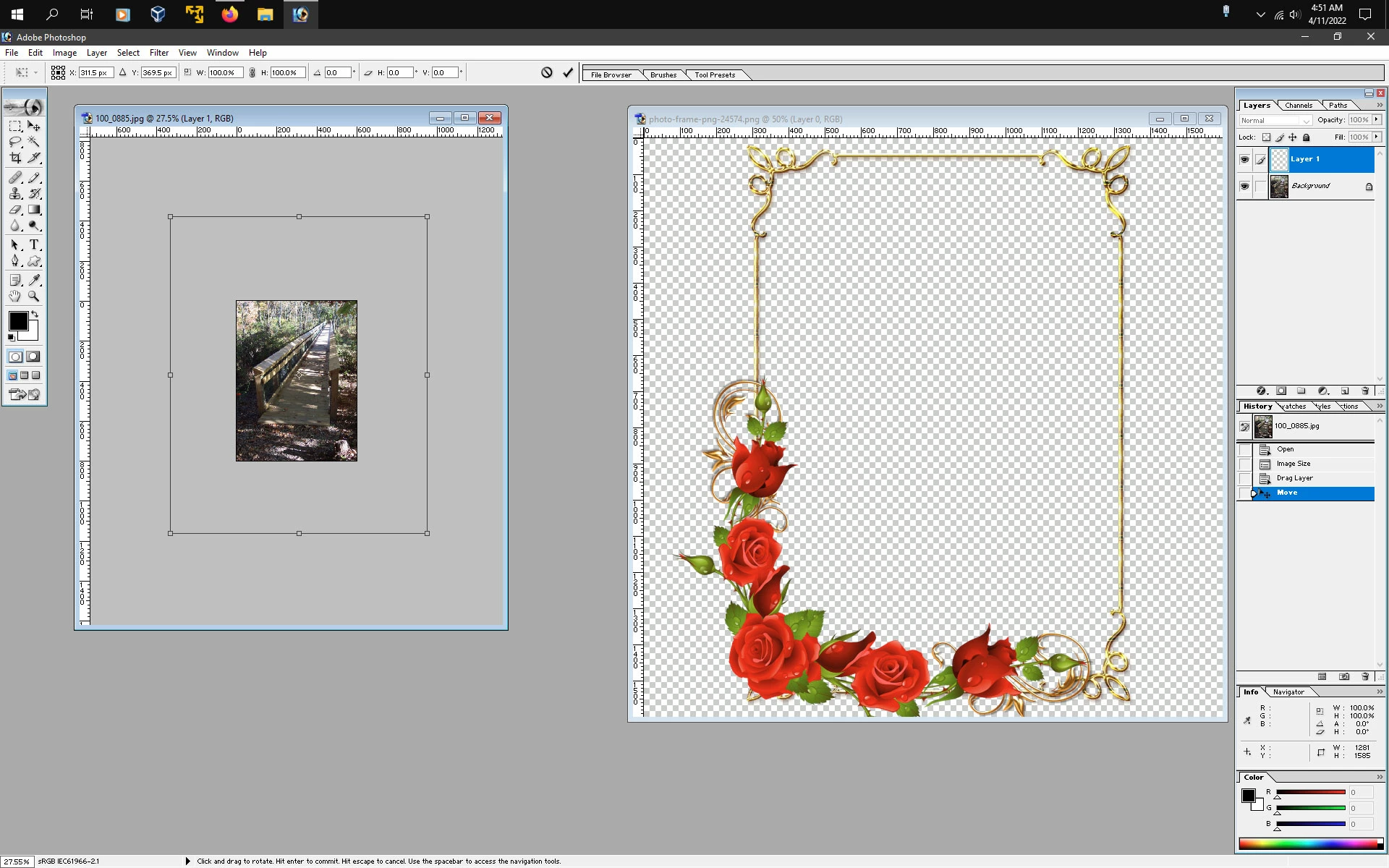 After I posted the last message message I was able to go to preference and transparency and I managed to change the background so now I can move the frame. I opend up the photo and put it next the frame. So now I have to move the frame around the photo
