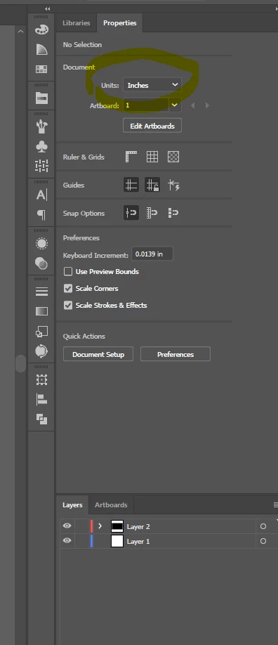 Units set to Inches, but Properties panel shows pixels