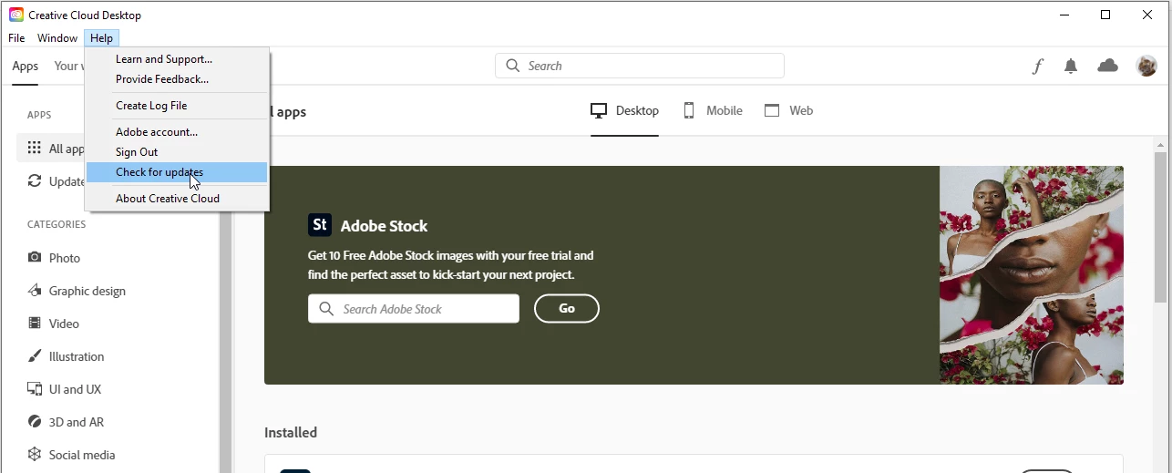 Go to the Adobe Creative Cloud app and check for updates from there