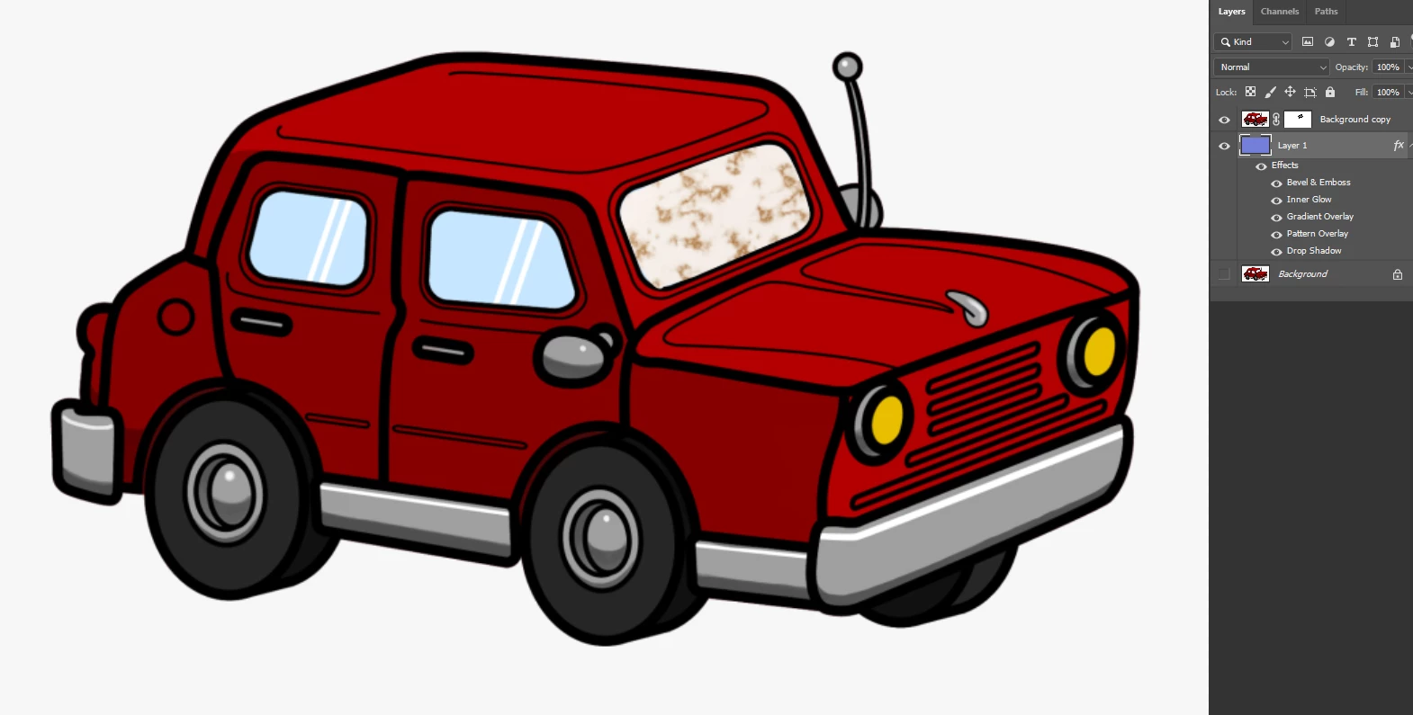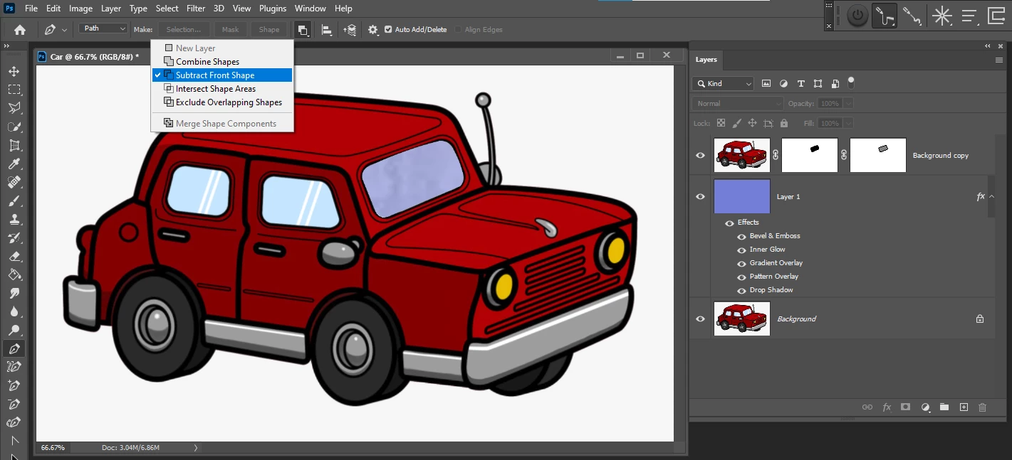 I am using Vector Maks to Delete the Window of this car. I can easily Delete It using a regular Mask, but I want to use Vector Mask. I use a Pen Tool to draw a Path, and Later I select my Path, and I control Click on Create Mask, and It workes fine.