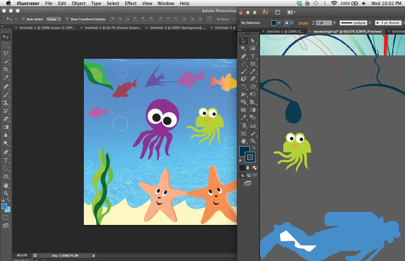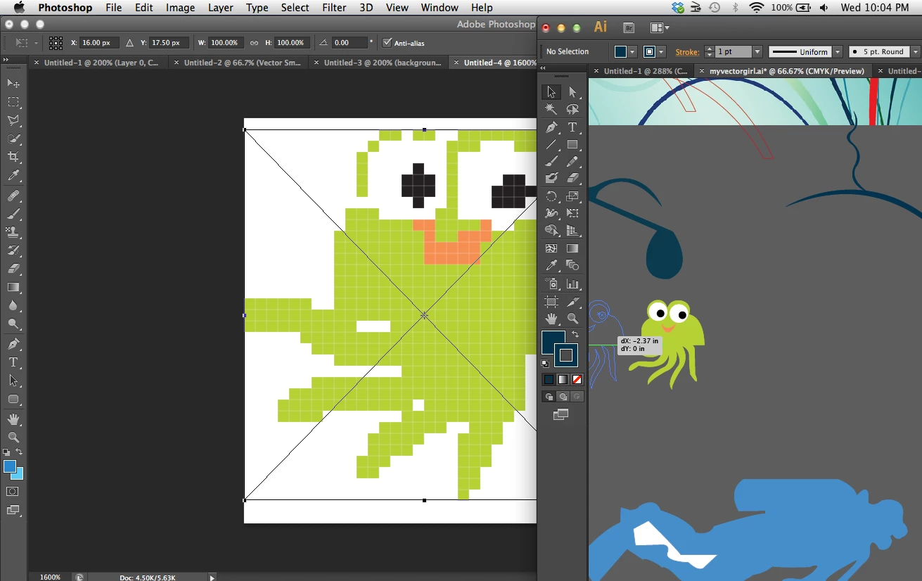 Here is a project I worked on a couple of weeks ago. Illustrator is on the right, Photoshop is on the left. I copied my little green guy into Photoshop with no problem.