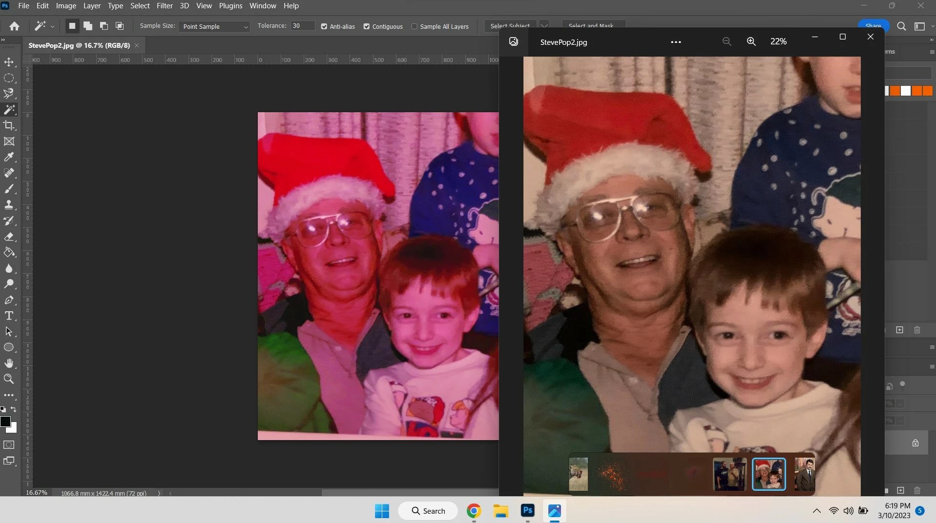 When I open a photo in Photoshop (and Illustrator for that matter) the colors of the photos are almost pastel looking. When I print the photos they look just like the original. The reason I'm putting the photos in Photoshop is to edit them. If they open like this I cannot edit them. This started about a couple months ago and I don't know why. I made no changes, it just happened. In the attached screenshot the original is the one on the right. Please help.