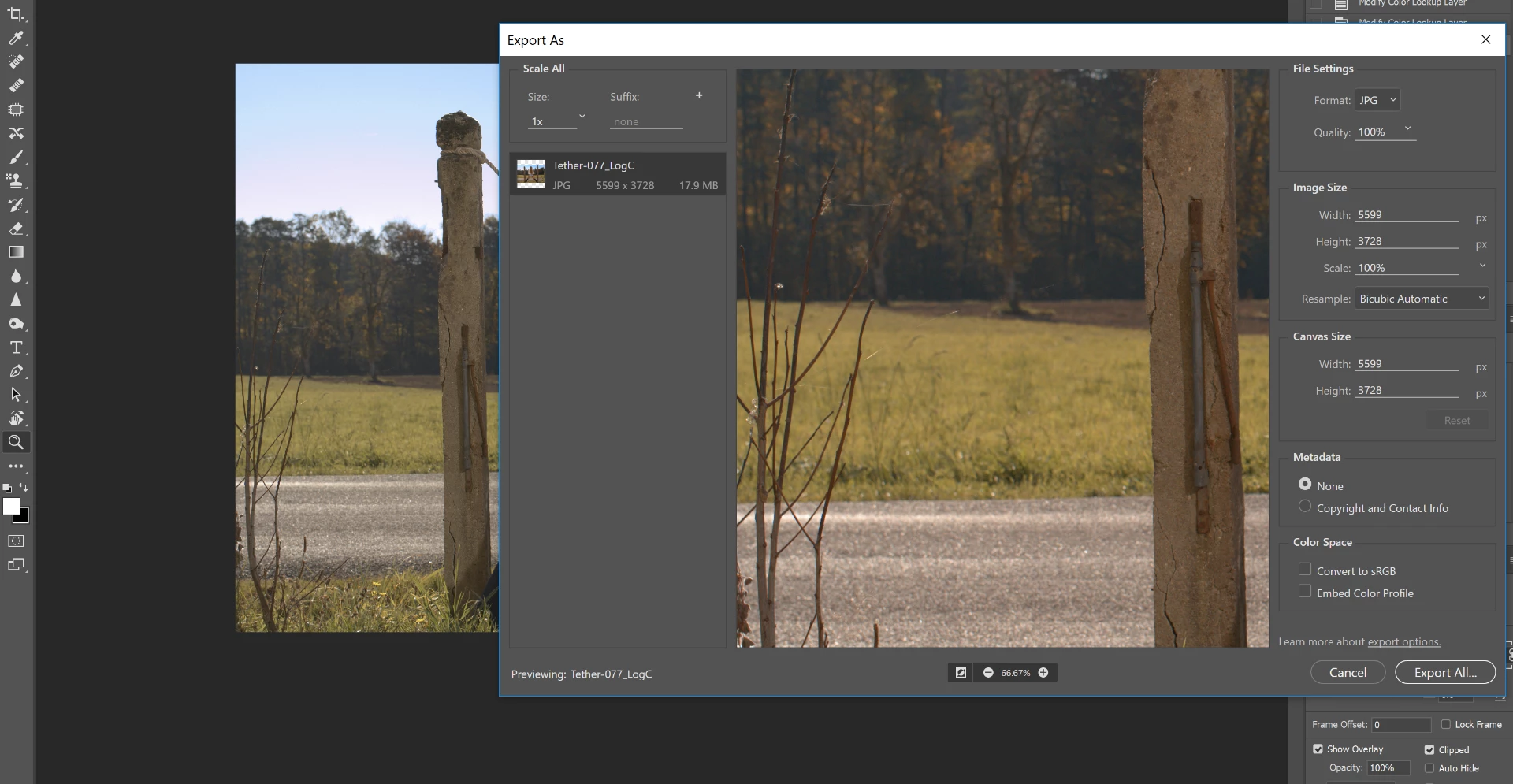 Here is a screenshot of the Export dialog, which colors shifted to warmer / red in comparison with the TIFF file opened in PS (visible in the background here)
