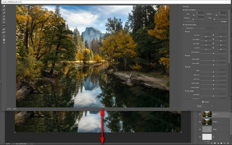 For instance if I open any image, then go to the Filter ? Lens Correction it only fills 3/4 of the screen vertically.