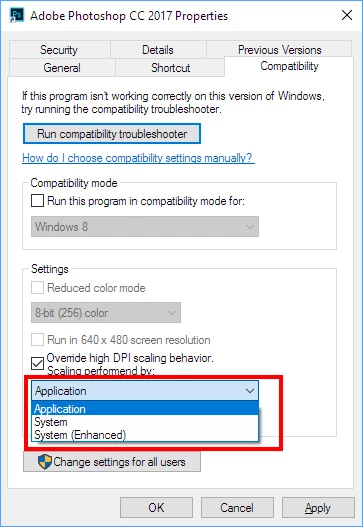In the latest Windows 10 Preview build 15002 Microsoft enhanced their Display scaling. You can now use Windows scaling with Application Like Photoshop if you want to. So you will not be stuck with Adobe UI 2X scaling. You can scale to any lower resolution l 1.25x 1.5xx 2X etc. You can set that up in the shortcut that you use to start Photoshop using the comparability Tab Override high DPI scaling behavior you will not longer have to modify Your Windows registry and add external manifest file for Photoshop.