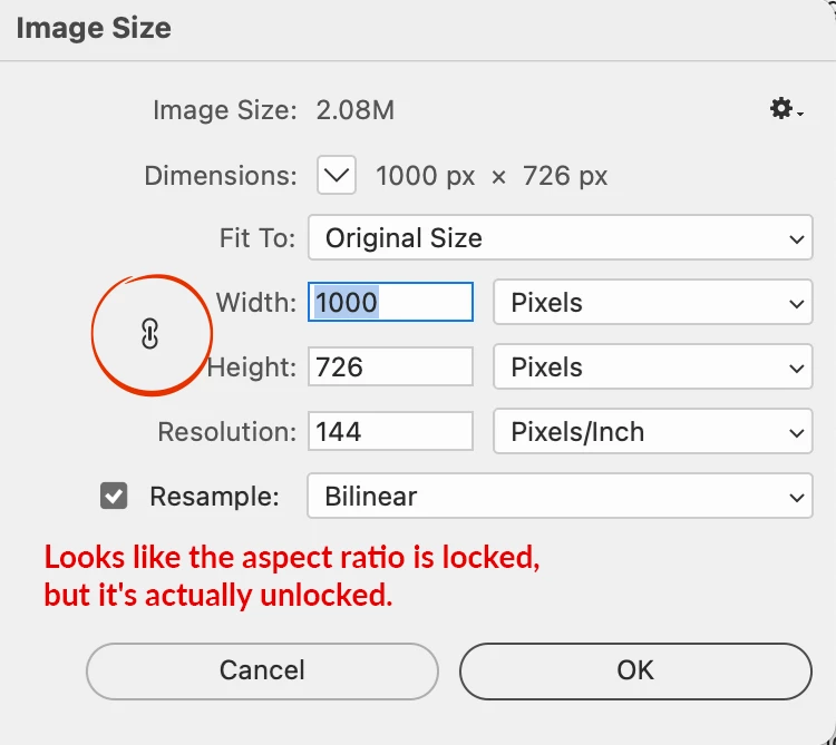 In the Image Size panel, there is a link icon that toggles whether or not the aspect ratio will be preserved when the image is resized. In its unlocked state, the icon shows a linked chain, which implies that the aspect ratio is locked. In its locked state, the exact same icon has a highlight around it. This is dumb. Please change it so the unlocked state clearly shows a broken chain.