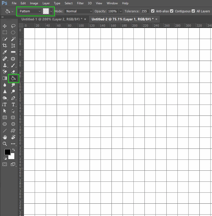 You are now good to go. SDelect the Paint Bucket tool and set it to Pattern in the Options bar. Choose you Grid pattern, and stamp it down in a new layer.