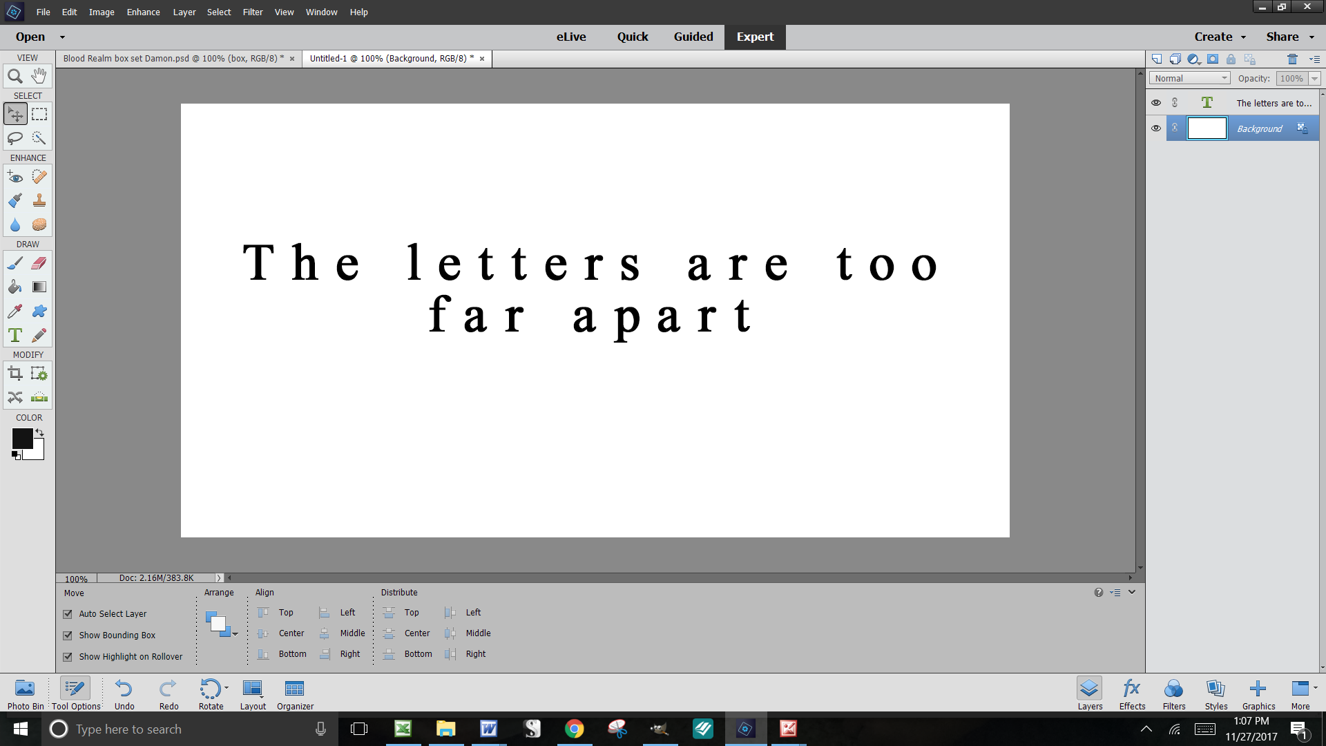 Just to be clear though, this means that Photoshop Elements 2018 does not have any option for adjusting kerning? There's no way for me to manually change the spacing between characters? This did fix my problem, but as soon as I want to change the spacing again (sometimes I do want more space between letters) I'll be back here asking where the kerning option is again.