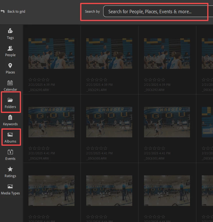 You can also use the Search box to find media that is in both an album and folder: