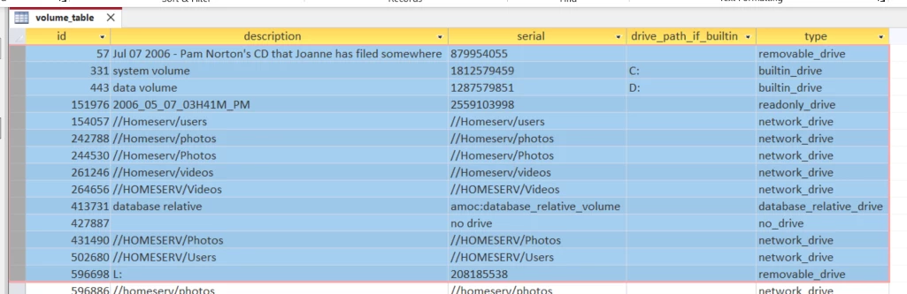 Here's an example of what's stored in the catalog for volumes in PSE2024. Note the serial column and drive_path_if_builtin. This hasn't changed much in many Organizer versions so I suspect 2022 look very similar: