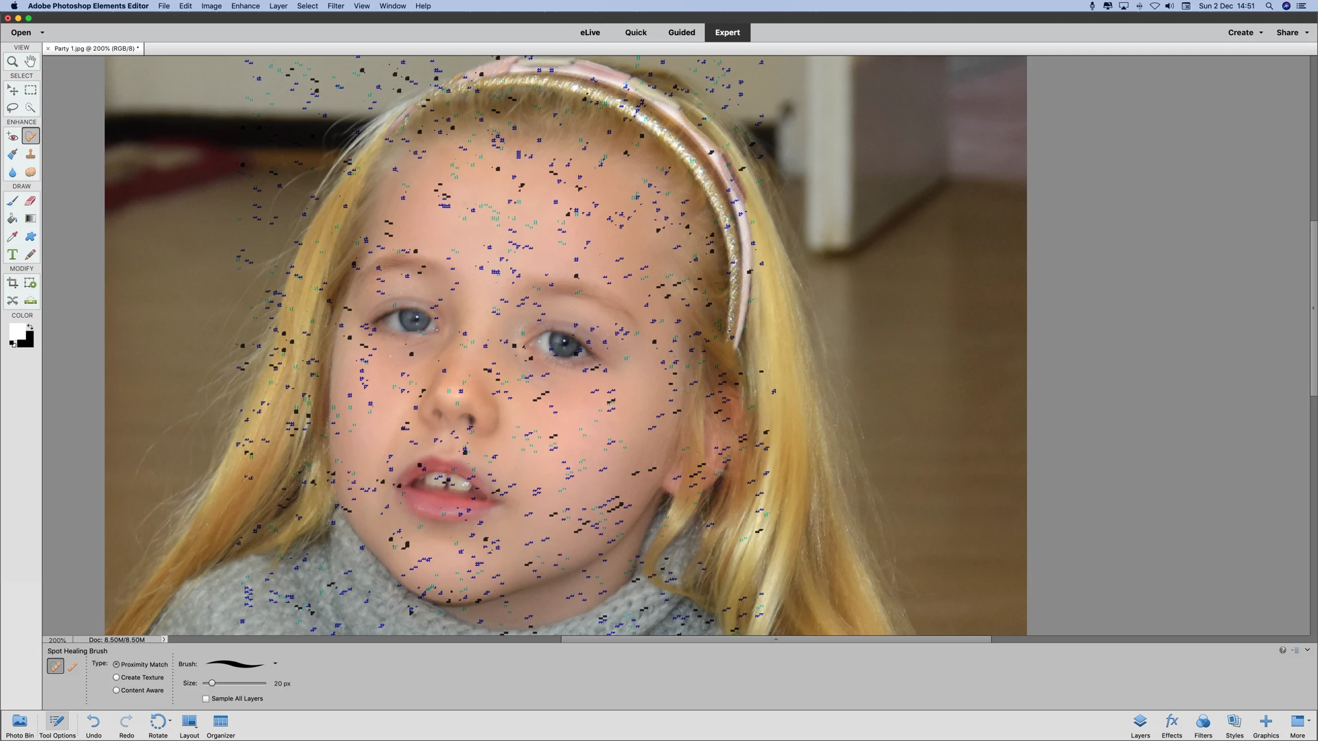 In photo elements 15, adjust facial features . After adjusting click Ok and the result is photo full of spots and wiggles in colours blue and green