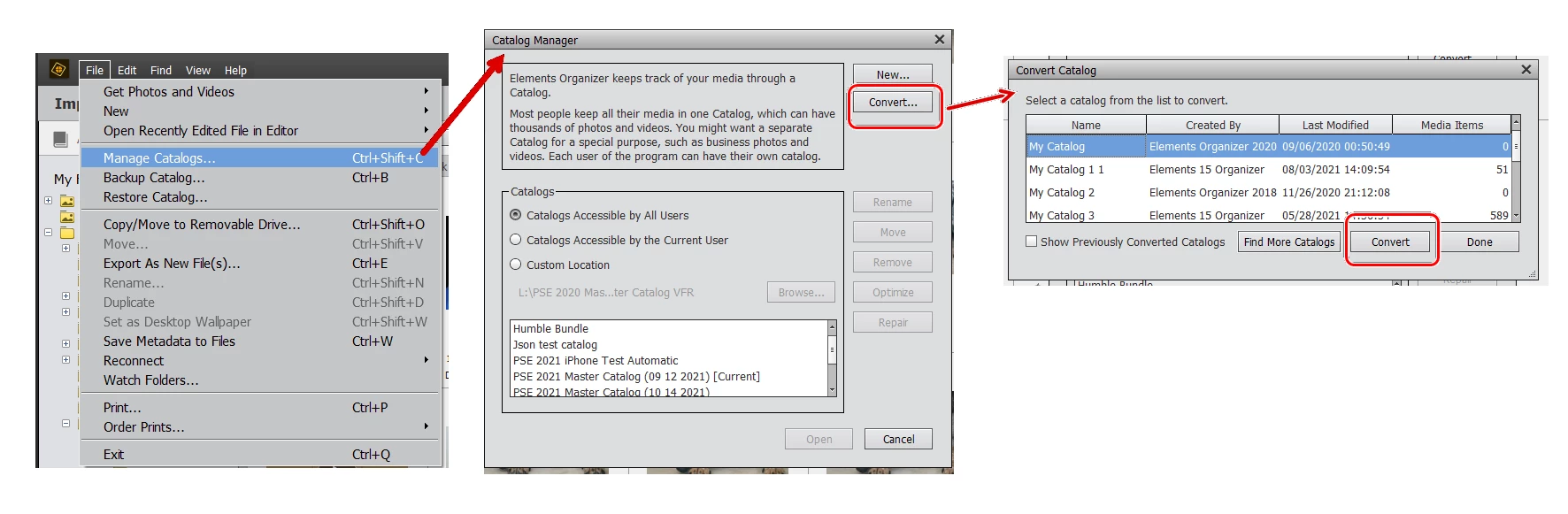 Ich habe heute Photoshop Elements 2022 installiert. In diesem Zusammenhang wurde ein Katalog aus PSE 2020 in die neue Version konvertiert. Jedoch nicht die 4 weiteren! Was kann ich tun, um auch diese Kataloge in PSE 2022 zu konvertieren?