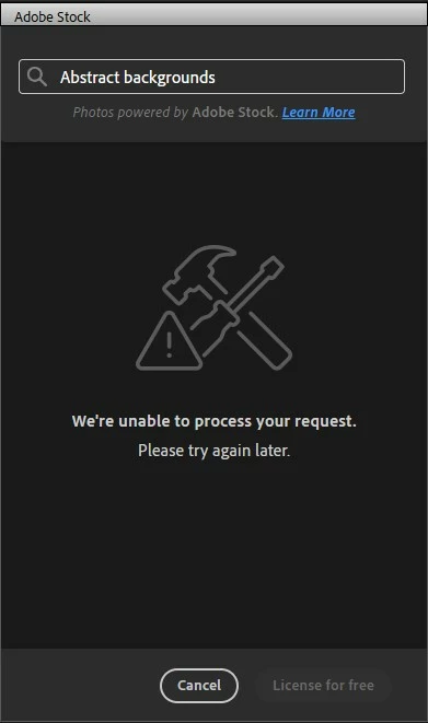 Yesterday and today I tried to use the Adobe stock intergration within PSE 2024 for the first time. I am logged in and my copy of PSE 2024 is fully activated. I get the error message that says, "We're unable to process your request, please try later"