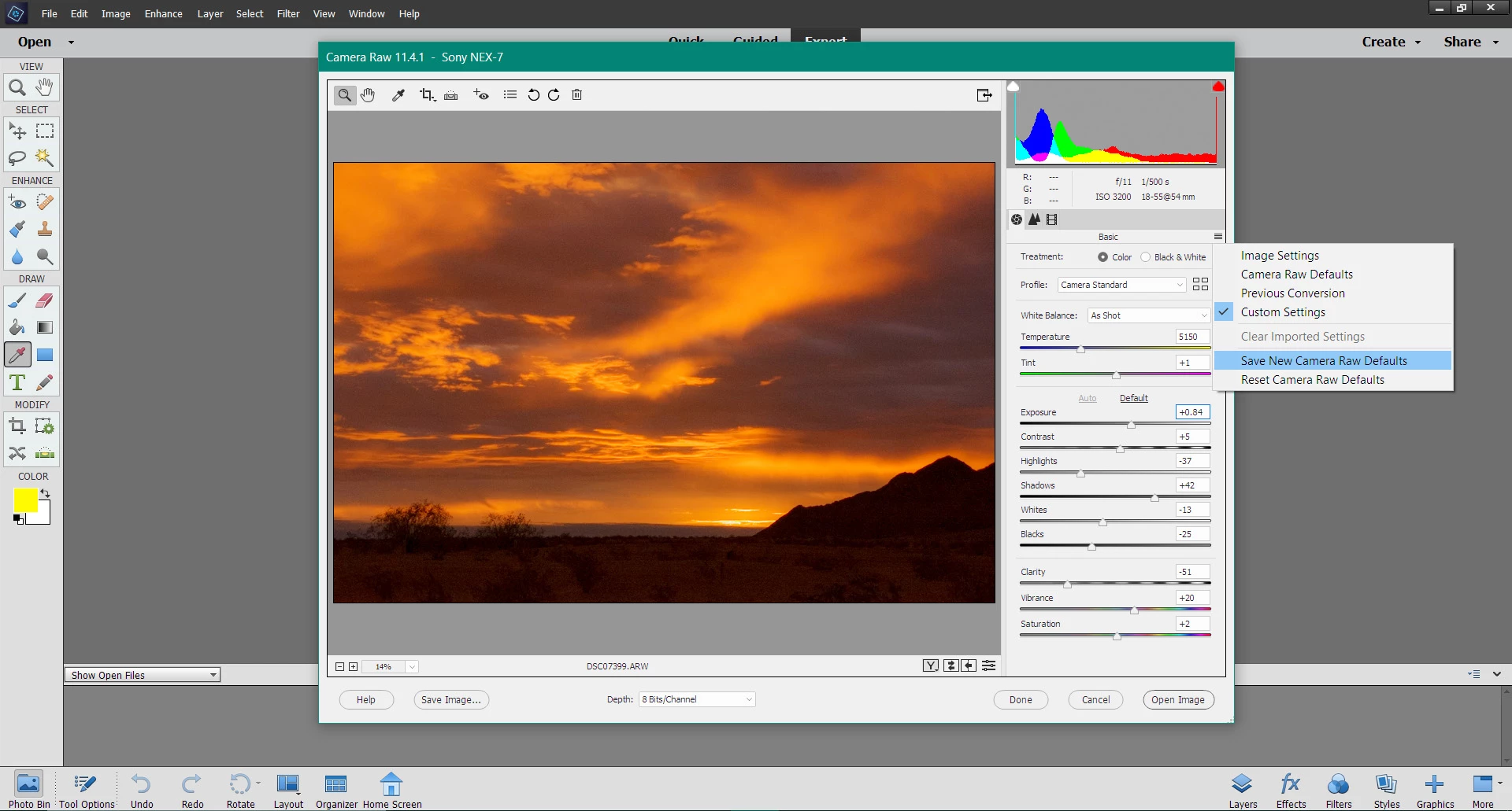 Unfortunately, the Adobe Camera Raw plug-in for Adobe Photoshop Elements' interface was changed in version 12.0 and one downside was that you can no longer Save New Camera Raw Defaults as you could in earlier versions.