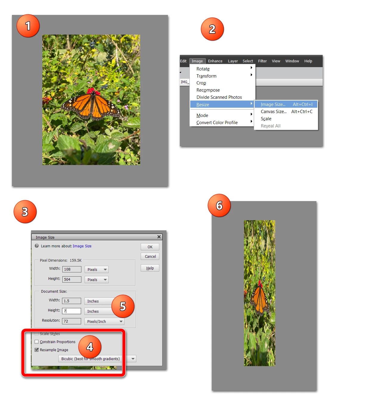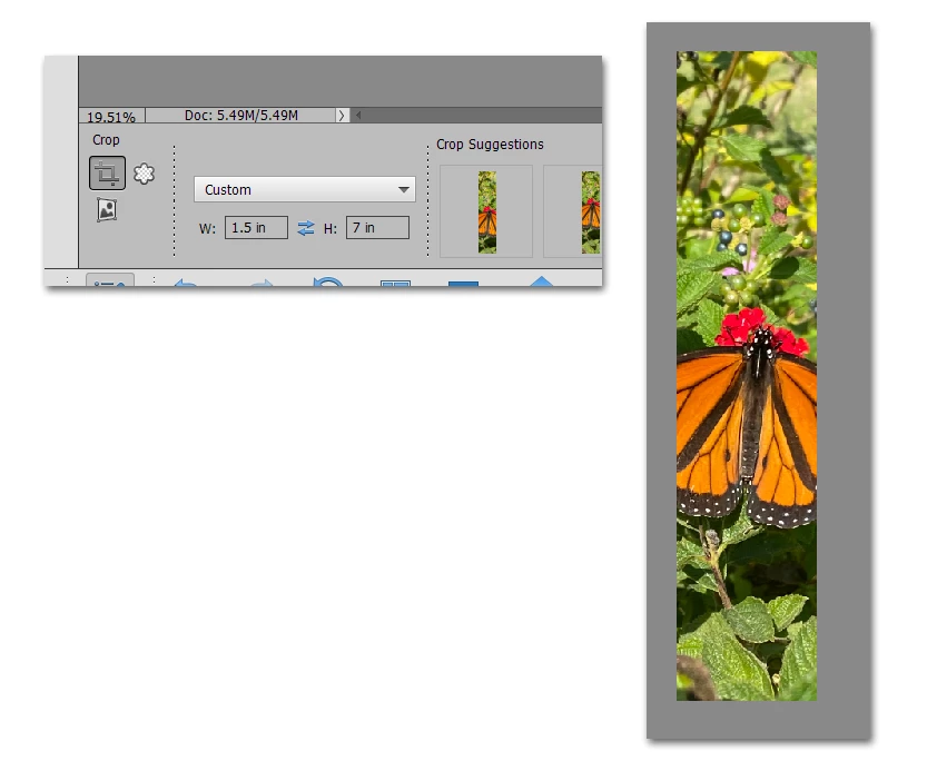 I want to resize a photo to fit a bead loom pattern measuring 1.5 in by 7.0 inch. How do I do that?