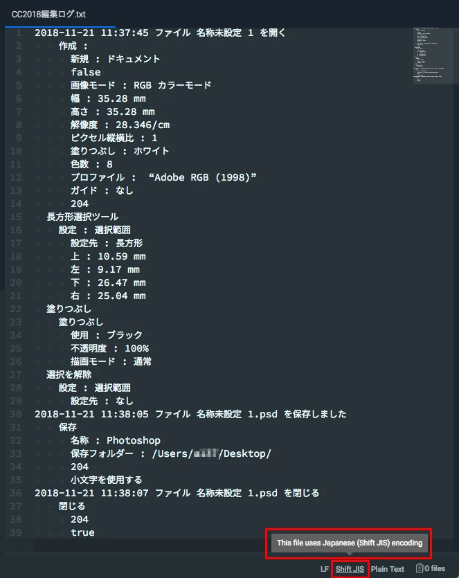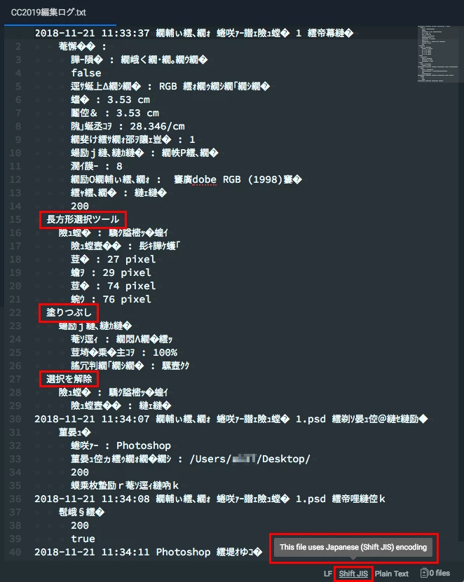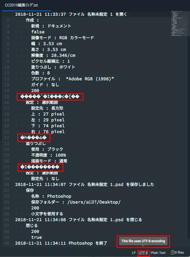 このことから、Photoshop CC2019 のヒストリーログでは「UTF-8」と「Shift JIS」が混在していることがわかります。