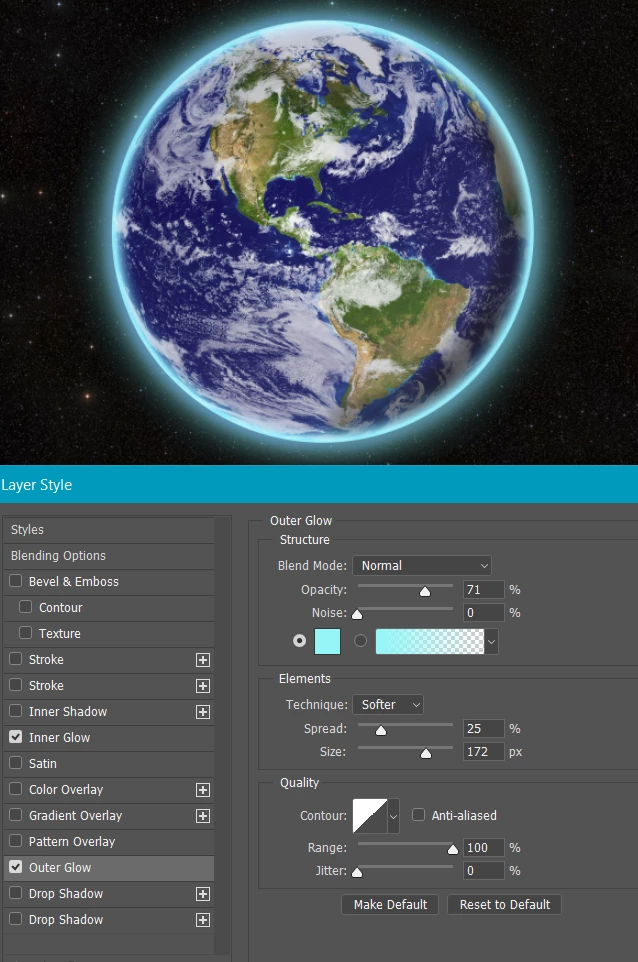 Or you could use a combination of both Inner and Outer Glow. As with Dave's method, you need the globe to be on its own layer like so