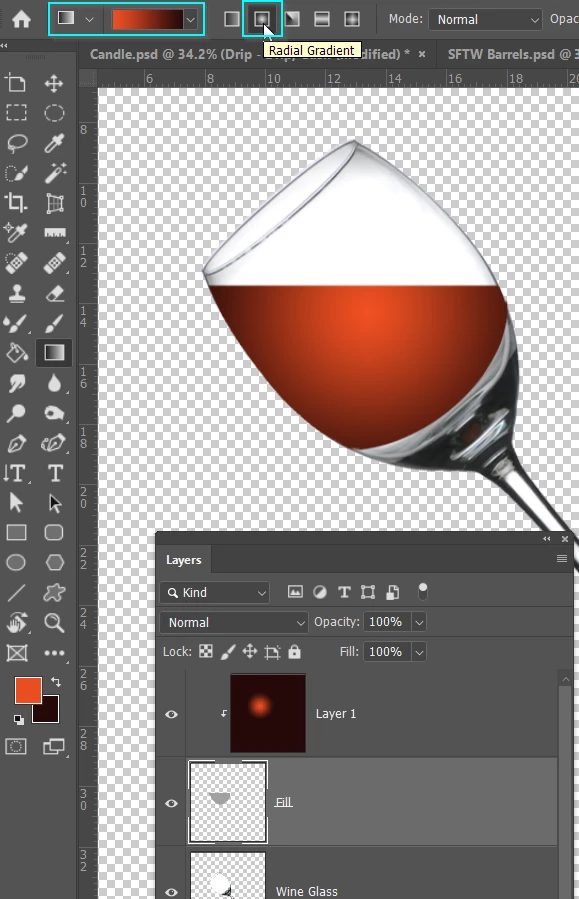 Then dragged out a gradient from the center of the glass, but on a new layer.