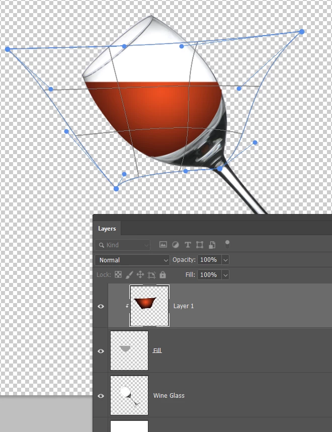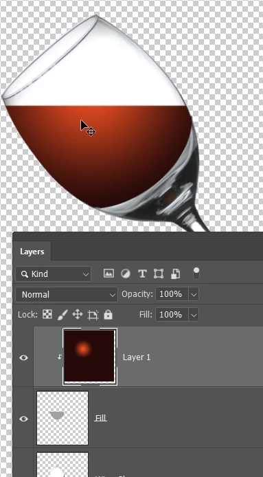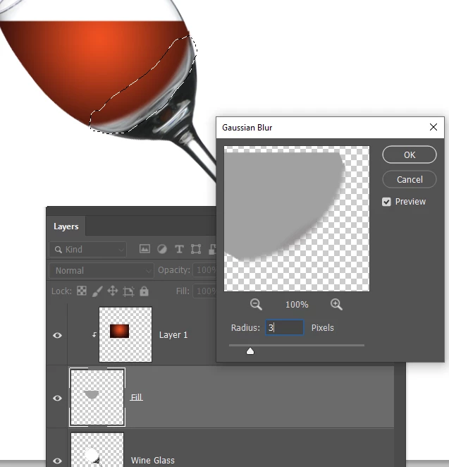 We can now use Gaussian Blur to soften just that bottom edge. You can see how the transition is softer there, but we still have a sharp outline in the rest of the wine layer.