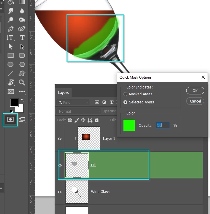 Note Quick mask usually uses red, and I have changed it to gree to show up against the colour of the wine