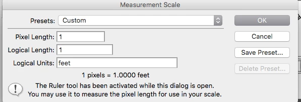 I apologize if this has already been addressed, and I may be overthinking this, but I am not sure how to set the custom measurement scale appropriately. I am trying to add custom scales for scaled foot and meter floor plans of 1/4" = 1'-0" (1:50), but I am not really sure how to do this... I have the dialogue box open to set the custom measurements, but what to write for "Pixel Length" vs. "Logical Length"? What does "Pixel Length" mean? Can someone help me to figure this out?