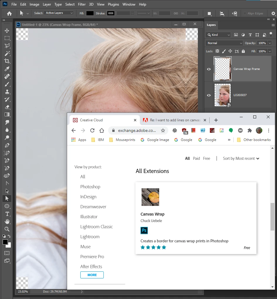 I create gallery wrap canvas prints by cloning the edges of the image - to be used to wrap around the stretcher bars. I use Perfect Resize to create the cloned images. The cloned parts are saved as layers. In Photoshop I add some canvas around the image and use the line tool to make marks on the outer edges at the layer edges - and those will show me where to put the stretcher bars.