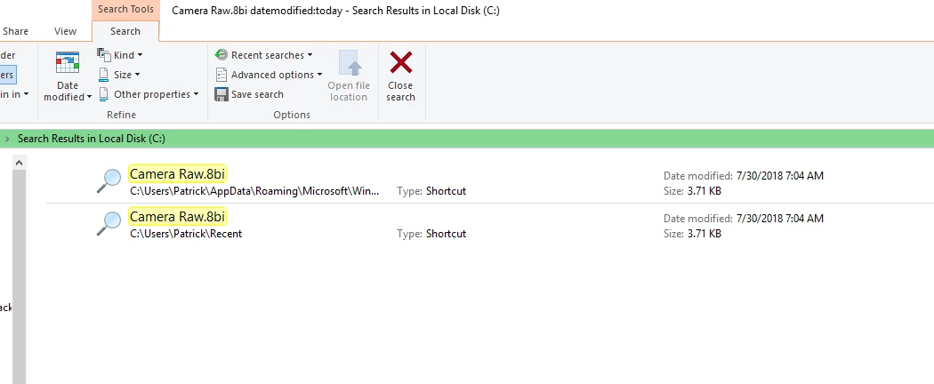 I've run many explorer searches - I've used Camera Raw.8bi as a search all it brings up is: