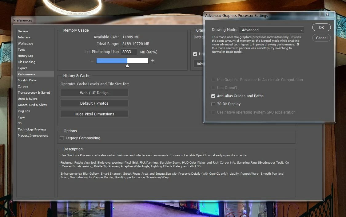 The perspective warp option is grayed out. Checking the advanced settings shows the "Use Graphics processor to accelerate computation is grayed out as well.