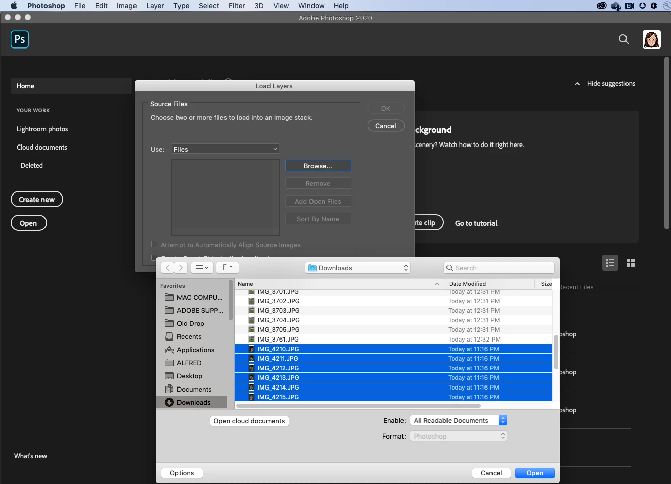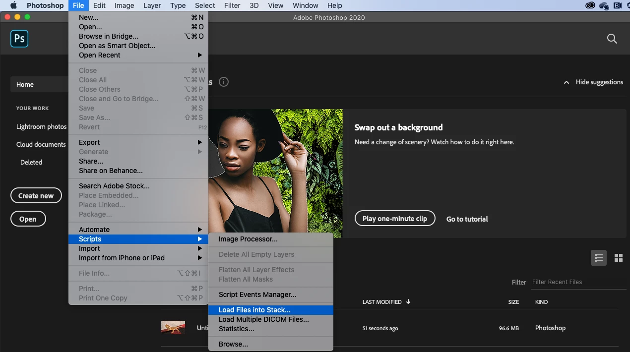- Open Photoshop and go to File > Scripts > Load Files into Stack