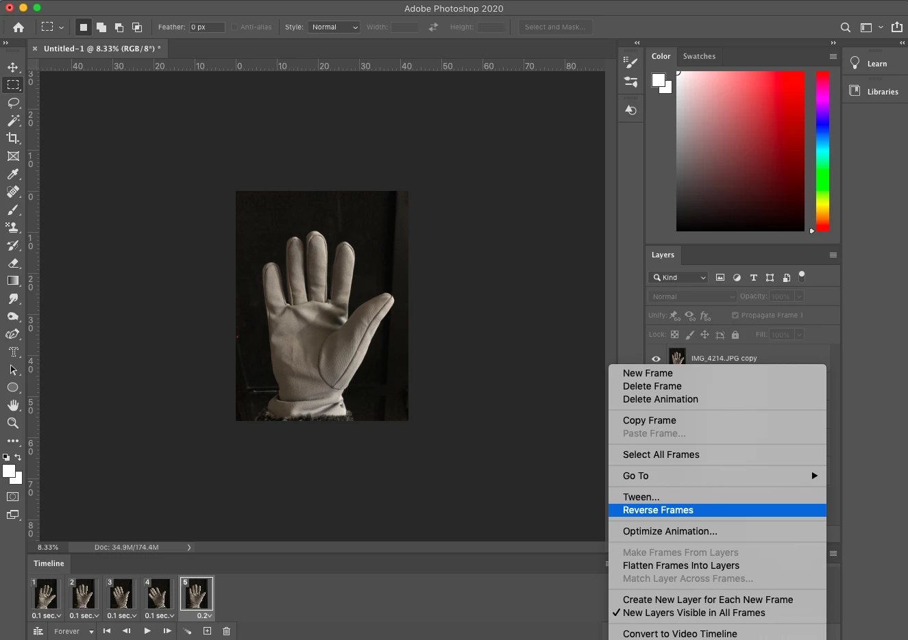 - If you want to reverse the way the animation is playing, click the Timeline menu icon again and select Reverse Frames