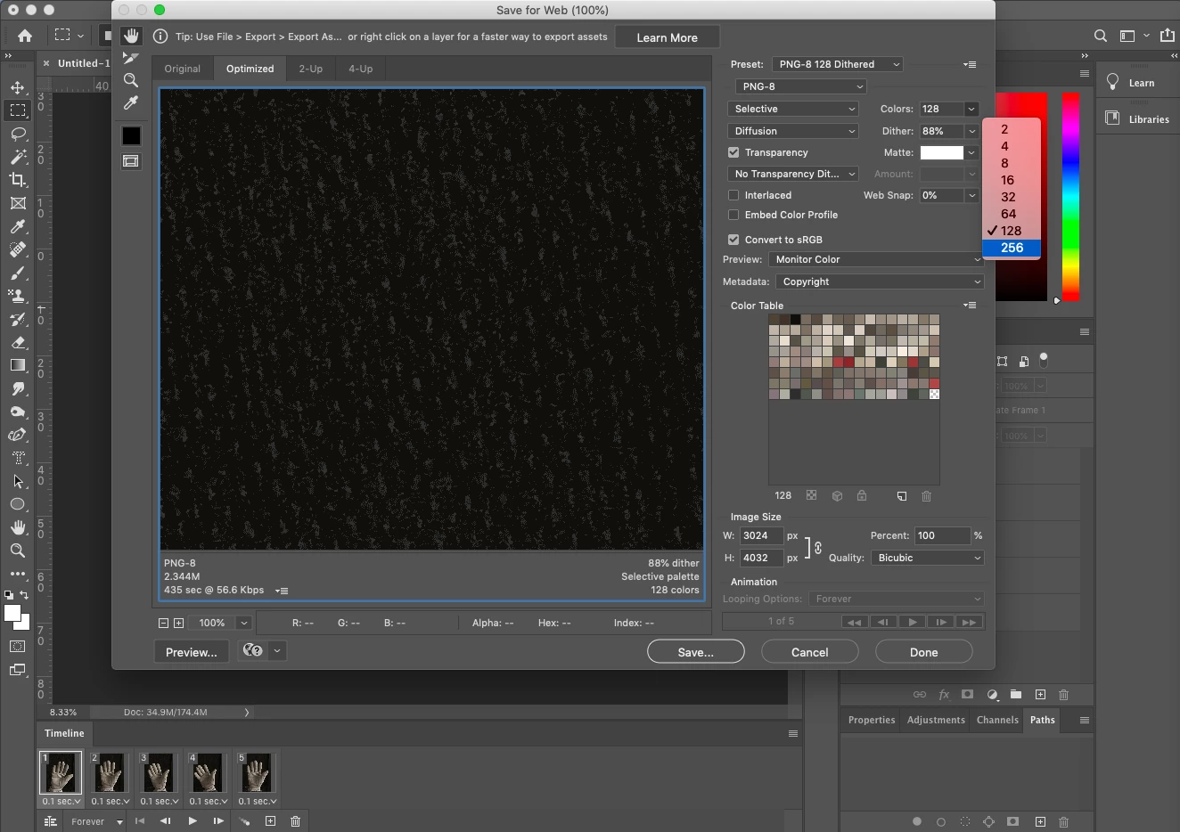 - Select GIF 128 Dithered from the Preset menu and then select 256 from the Colors menu
