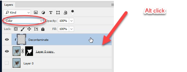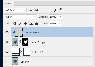 4. I added an empty layer above the masked bird and set its blending mode to color. I then Alt clicked on the boundary so that the layer is clipped to the layer below (as indicated by the small down arrow)
