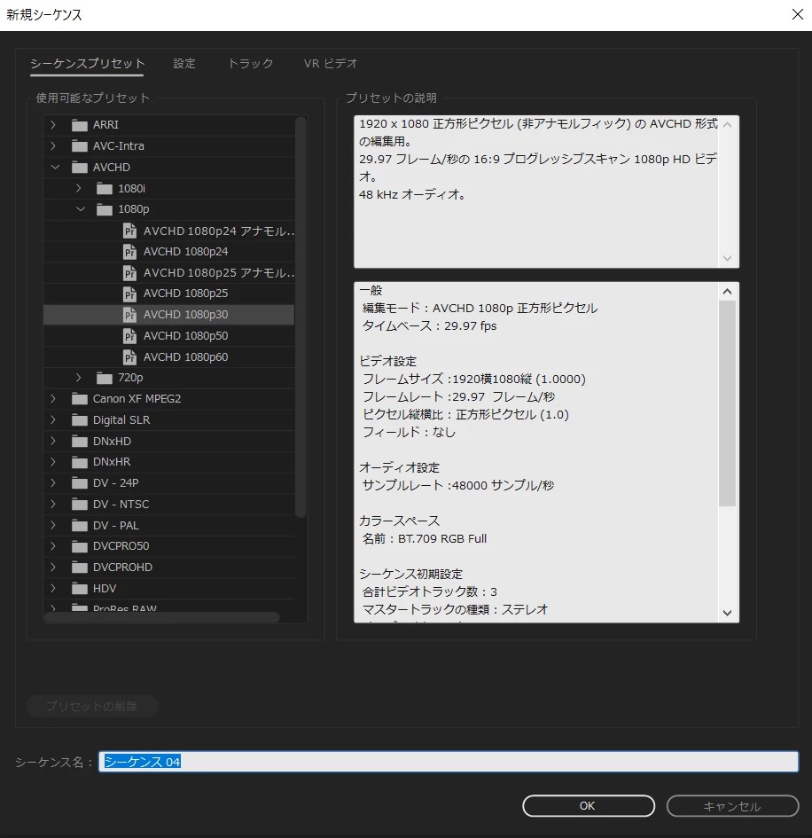シーケンス設定の仕様    フレームサイズ;1920×1080、フレームレート;29.97fps、プログレッシブ