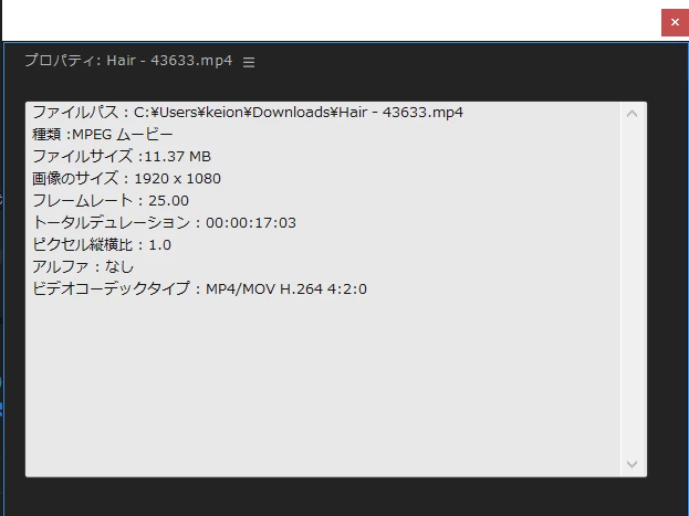 クリップ(映像素材)の仕様 フレームサイズ;1920×1080、フレームレート;25.00fps、プログレッシブ