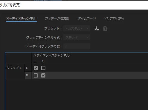 「ステレオ(ステレオフォニック)」と「モノラル」という言葉を厳密に捉えると少し不正確な表現になってしまうのですが、今回のようにクリップの出力を左右共に「L」にした場合、いわゆる「モノラル」になった状態です。
