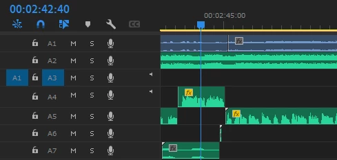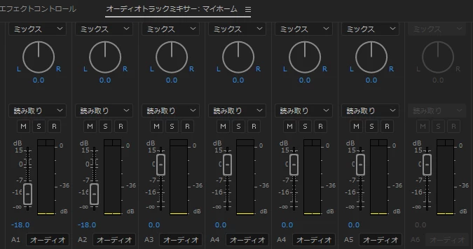 ・タイムライン上のA5トラックはオーディオトラックミキサー上のA4トラックの内1つに割り当たっており、以降同A6トラック➙A5、A7トラック➙A6...のように1つズレて割り当たっている。(例:A6トラックの音声でA5トラックのメーターが振れる)