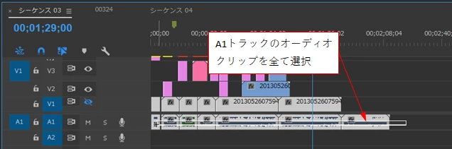 ①A1トラックのオーディオクリップ全てを選択します。