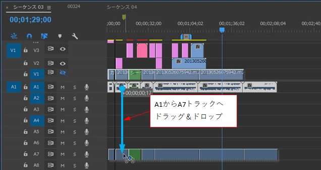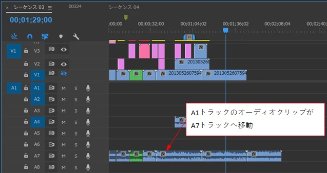 ③A1トラックのオーディオクリップがA7トラックへ移動します。