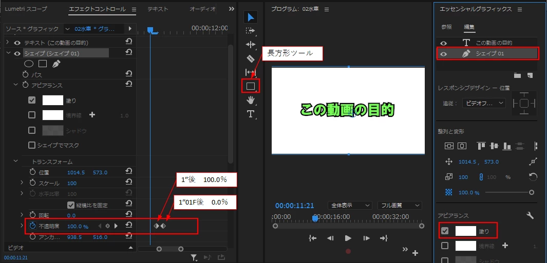 ③このシェイプを1秒後に非表示にするには、「エフェクトコントロール」パネルで「シェイプ(シェイプ01)」の「トランスフォーム」の「不透明度」にキーフレームを打ちます。1秒後100.0%、1秒01F後0.0%です。