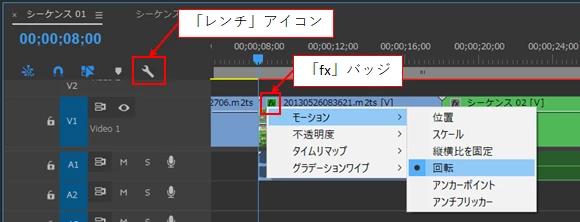 クリップキーフレーム(ラバーバンド)はいくつかのパラメーターがあります。そのパラメーターを切り替えるには「レンチ」アイコンをクリックし、開いたメニューから「fxバッジを表示」を選択します。するとトラックに配置のクリップの左上に「fx」バッジが表示されます。この「fx」バッジを右クリックするとメニューが開きますので、パラメーターを切り替えることが出来ます。または、クリップの上で右クリックし、開いたメニューから「クリップキーフレームを表示」を選択すると同様に切り替えることが出来ます。