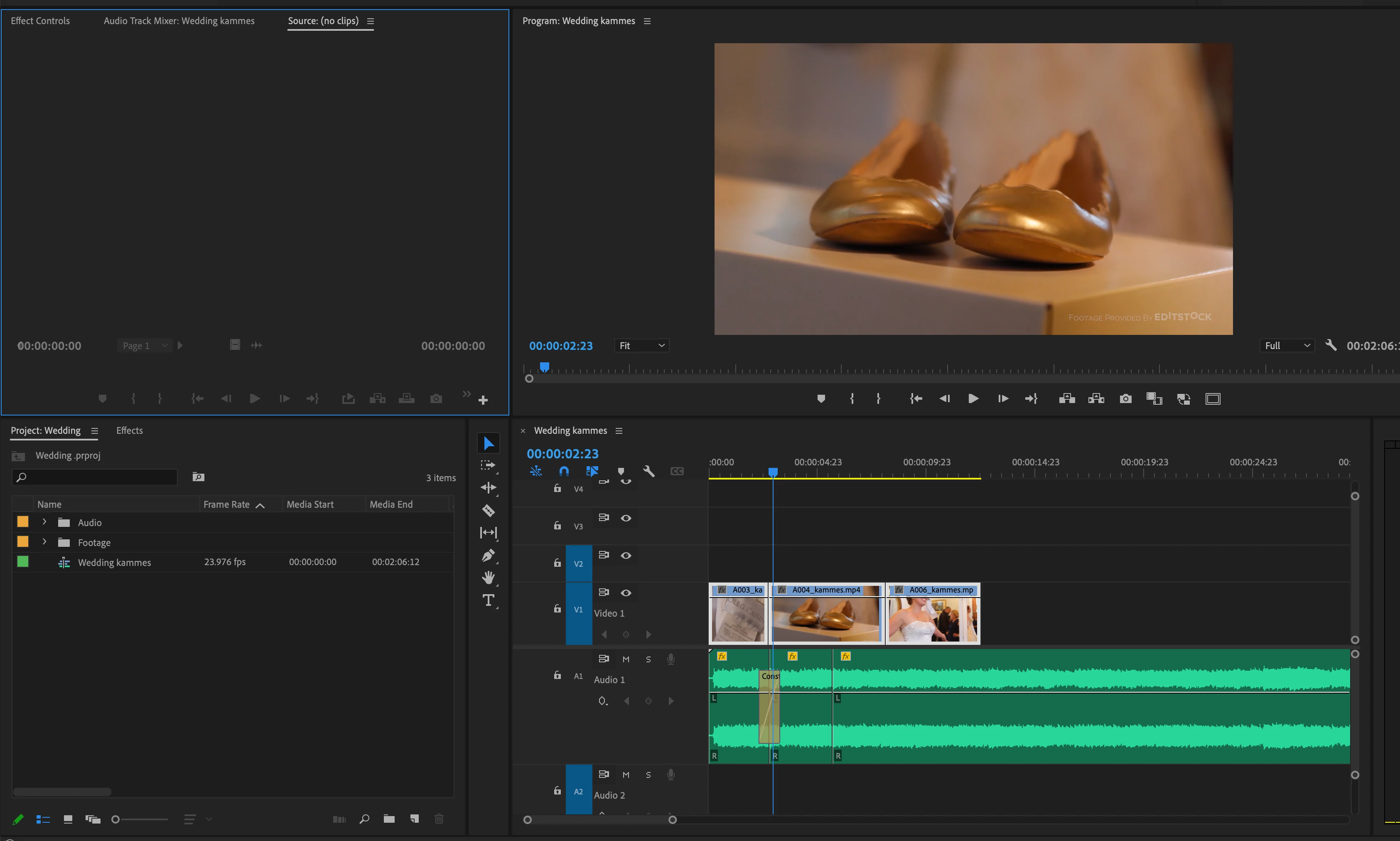 前後の流れを確認するためにタイムラインの映像を流そうとしスペースバーを押すと現状はソースパネルの方に青い枠が選択されていてソースパネルの映像が流れてしまうと思います。