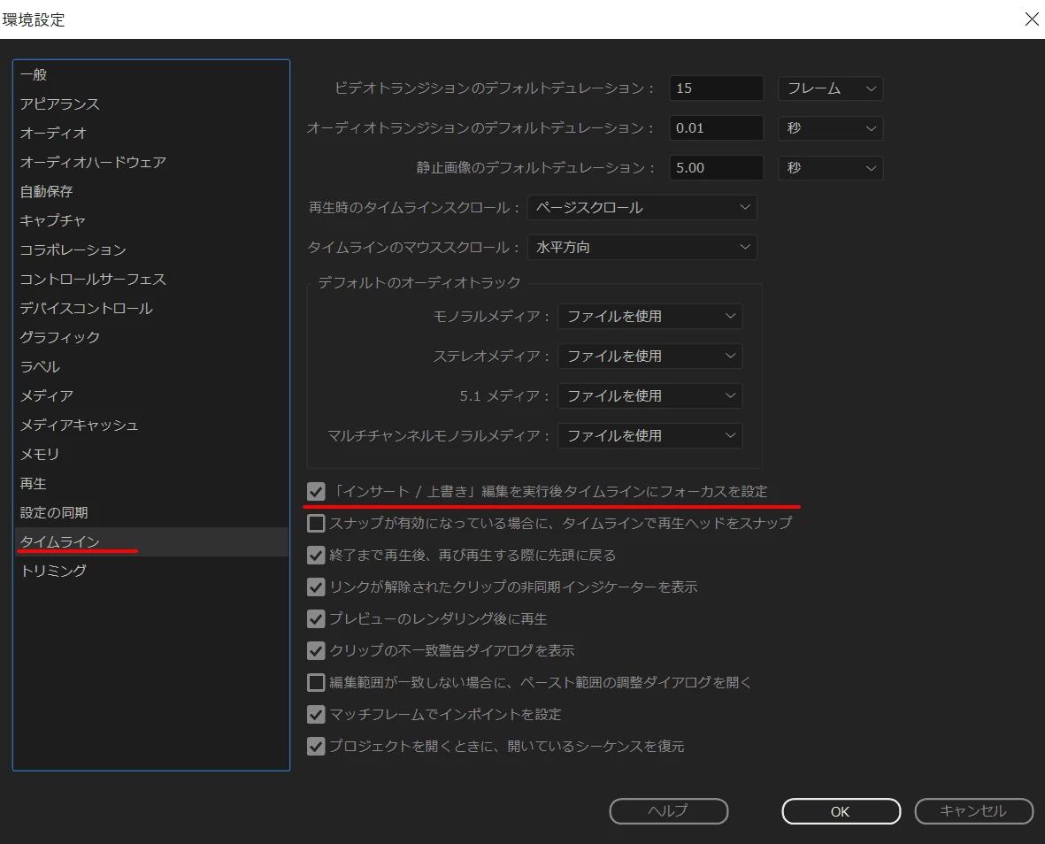 ショートカットキーでソースパネルやタイムラインを選択できる状態にしたい