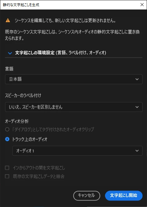 すると「静的な文字起こしを生成」ウィンドウ(下図)が開きますので、「文字起こしの環境設定(・・・・・)」項を展開して従来と同様に設定します。