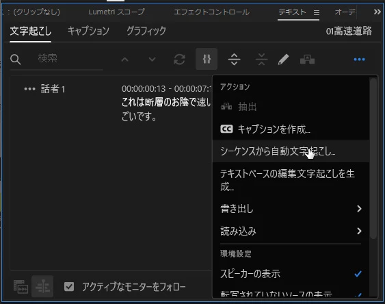 シーケンスから自動文字起こしが選択できない