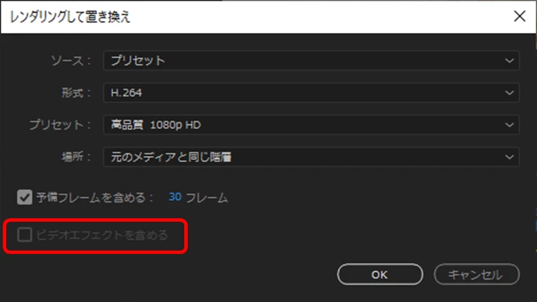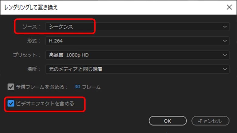 そこでいろいろ試したところ、「ソース」項を「シーケンス」に変更したら、「ビデオエフェクトを含める」項目にチェックを入れることができるようになりました。