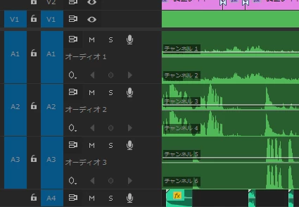 その際に、不要なチャンネル(モノラルで良いご自身の声の2つのチャンネルのうち1つ)はチェックを外し、オーディオクリップの数を減らしていただくと良いのではないかなと思います。