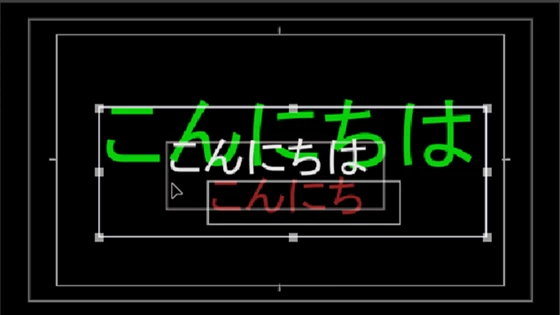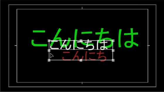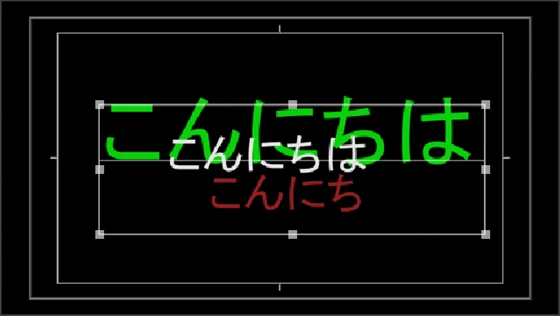 ①図のように1個のレガシータイトルに3個のテキストオブジェクトが重なっており、緑のテキストオブジェクトの内側に白と赤のテキストオブジェクトがあるとします。白と赤のテキストオブジェクトは、緑のテキストオブジェクトの内側にあるので、選択出来ません。ここではこの状態から白のテキストオブジェクトを選択する方法を説明します。
