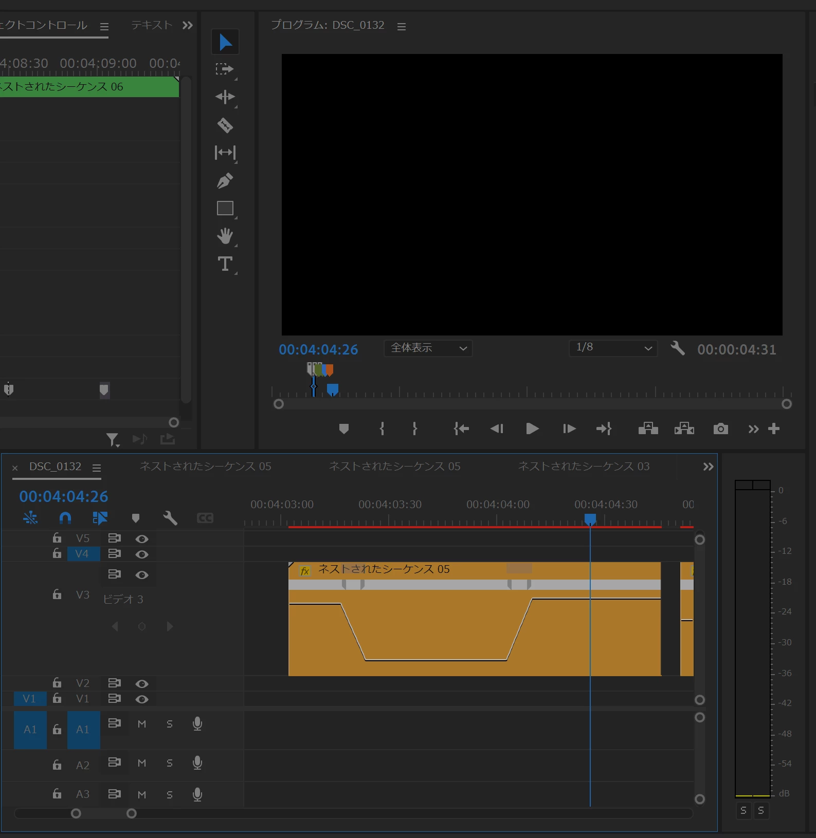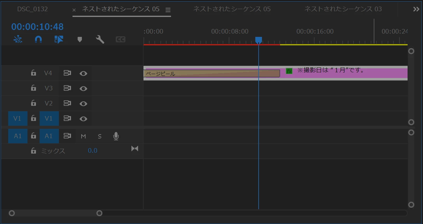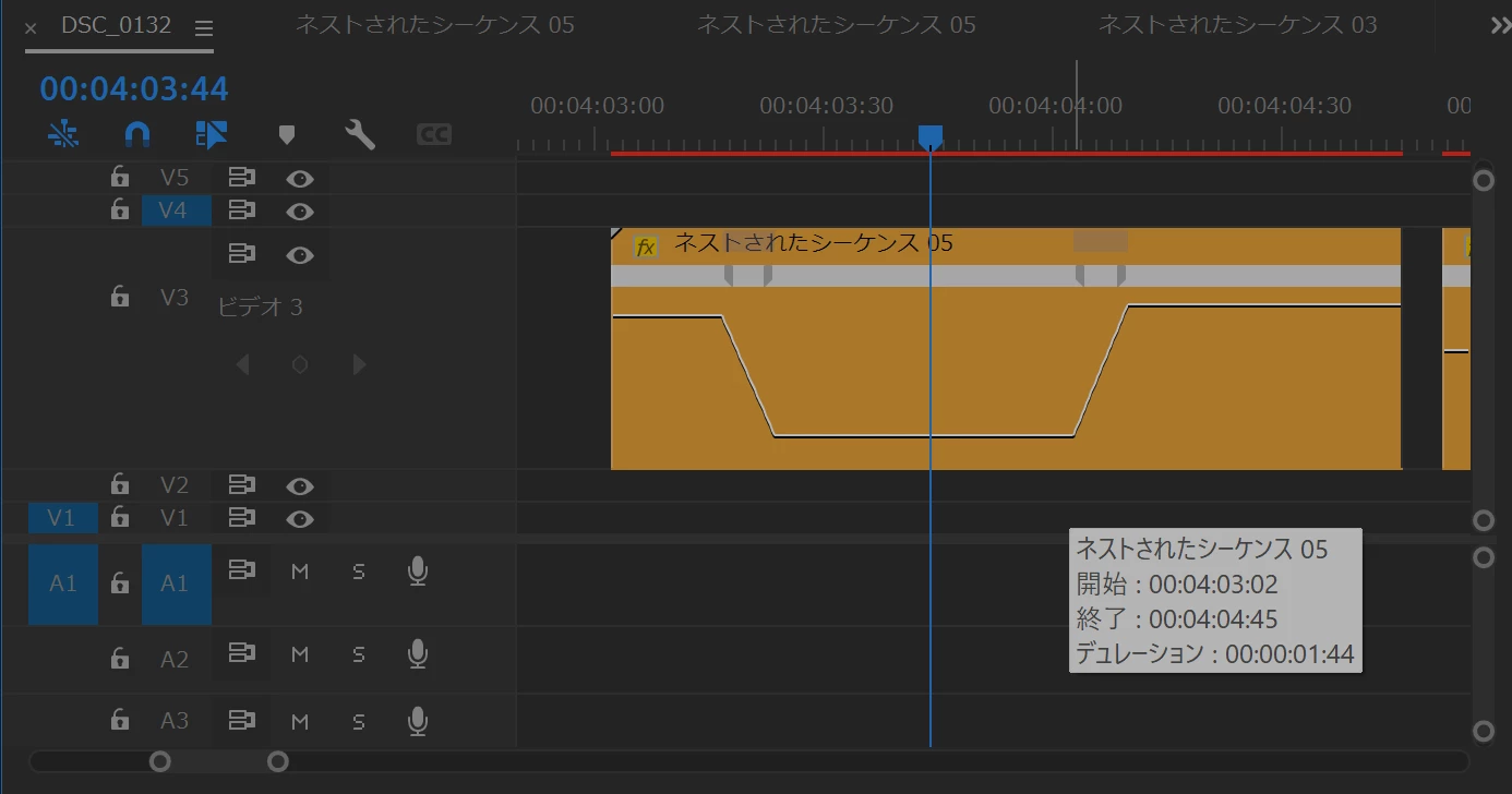 「ネストされたシーケンス05」クリップ(黄色のクリップ)の右側が短いように思います。クリップの右端を伸ばしてクリップのデュレーションを長くしたらいかがでしょうか(下図は私の例です、トランジション終了から5秒間に設定)。